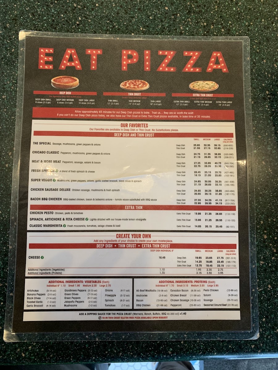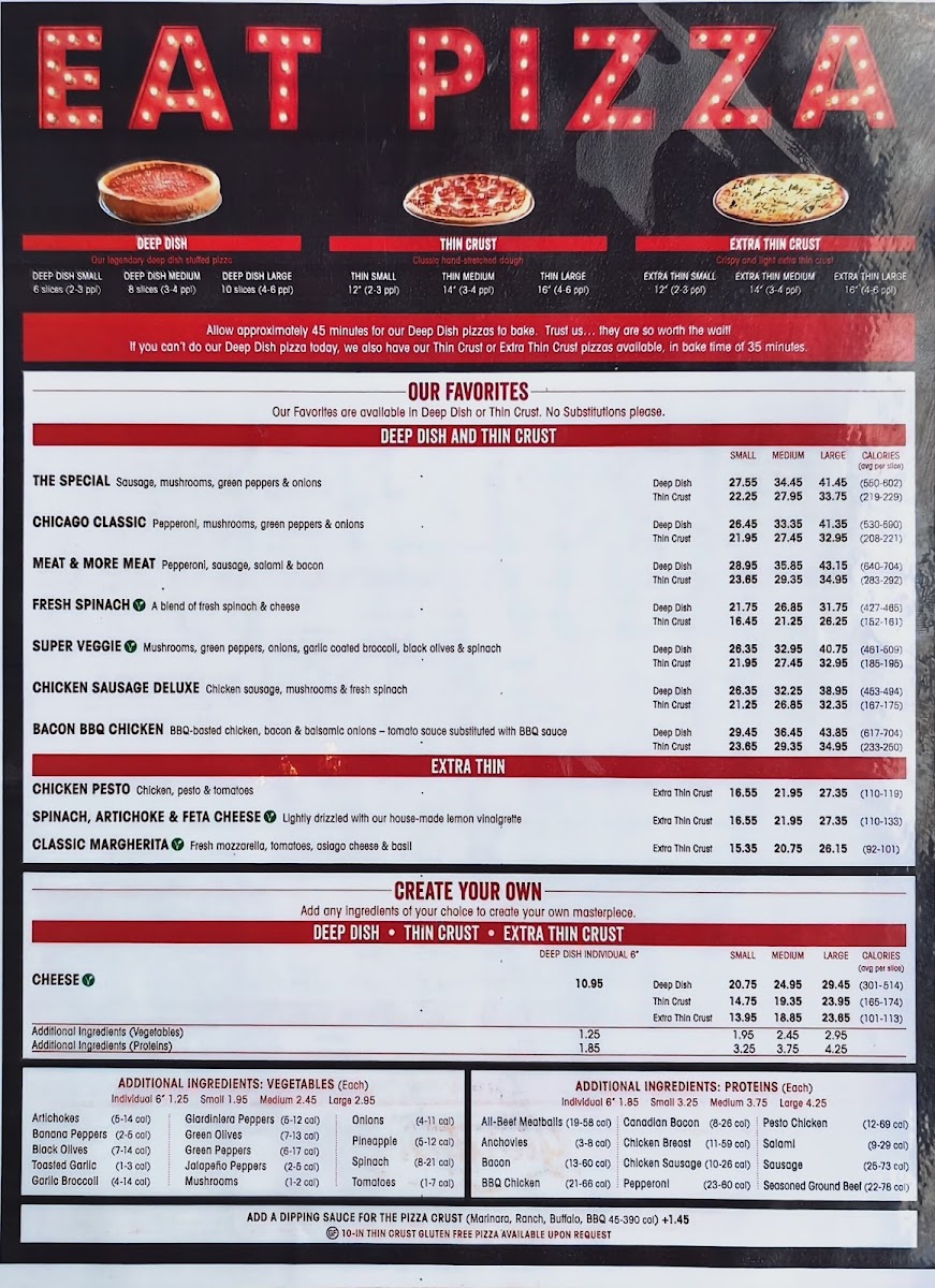 Menu highlights like the Italian Beef sandwich and traditional chicken wings complement the pizza, offering variety that suits both midday meals and casual evening gatherings. The appetizers and sampler platters create an inviting atmosphere, perfect for starting the meal or pairing with drinks when catching up with others.